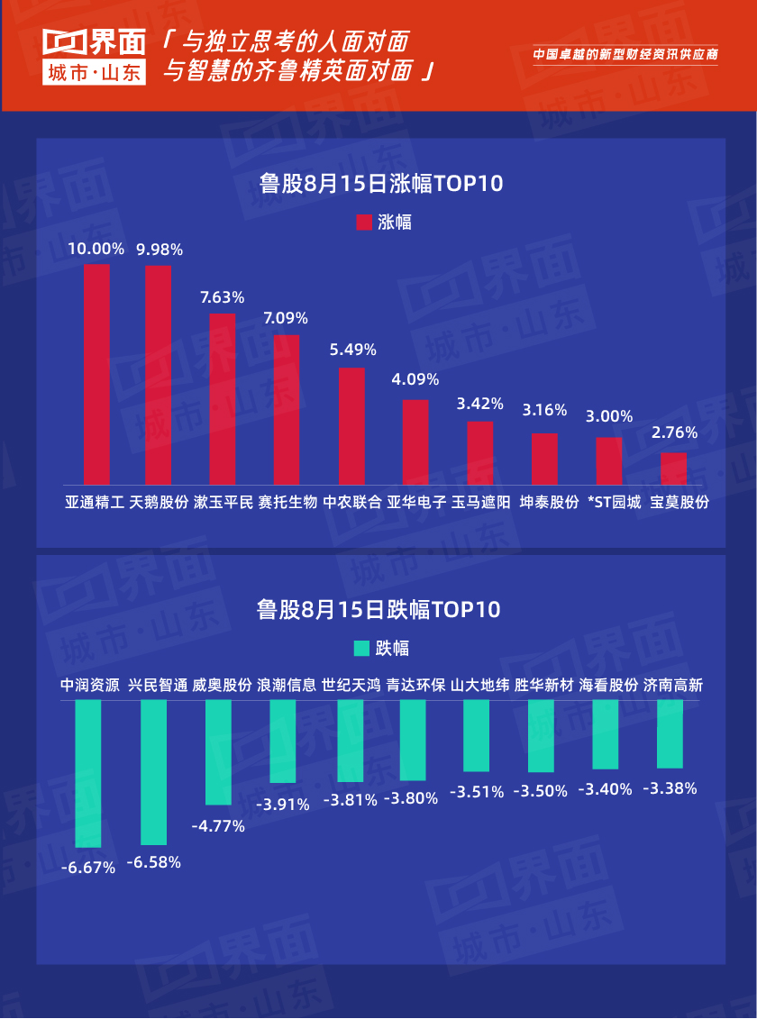 8月15日,山东省内沪深股票有101只个股上涨,191只个股下跌;总市值过千亿的有万华化学(600309)、海尔智家(600690)、兖州煤业(600188)、青岛啤酒(600600)、中航沈飞(600760)、山东黄金(600547)、潍柴动力(000338)共7家,500亿-1000亿的共有6家,分别是中际旭创(300308)、华鲁恒升(600426)、歌尔股份(002241)、浪潮信息(000977)、华电国际(600027)、中泰证券(600918)。