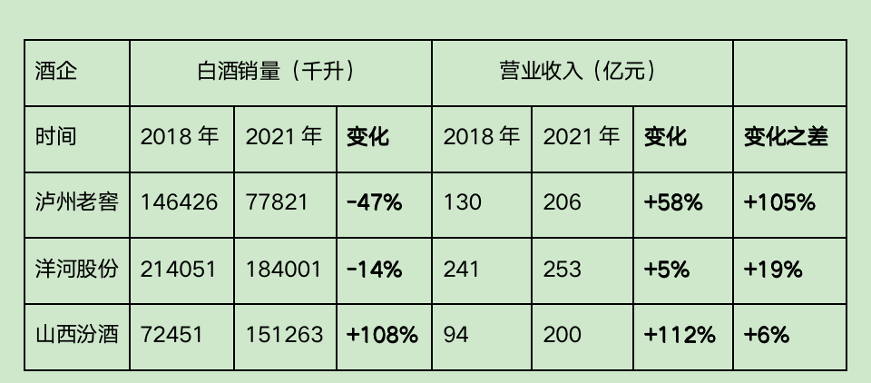 通过一个简单统计,可以看出白酒三雄正以三种截然不同方式各自进化。泸州老窖在销量几乎减半的情况下,完成了业绩高增长;洋河股份在小幅缩量的情况下,维持了业绩增长;山西汾酒以量取胜,借助翻倍的销量实现了翻倍的营收。