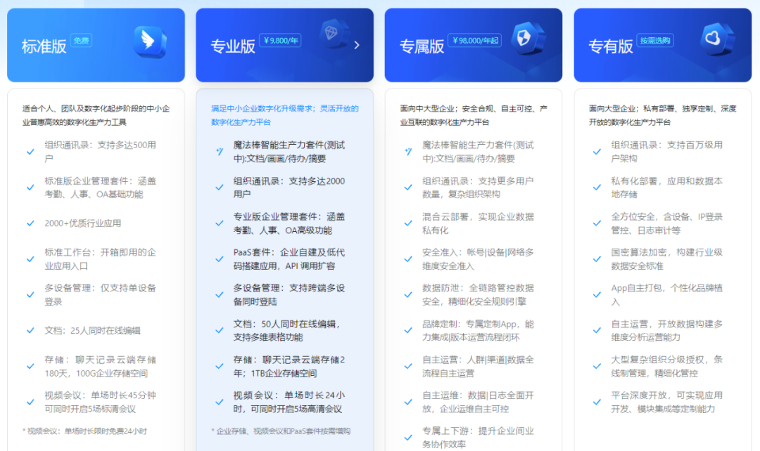 2022年3月,钉钉推出面向中小企业的专业版钉钉,年费为9800元。随后,钉钉形成了三种主要商业化模式,即“三专”年费模式、平台分润模式,以及硬件许可模式。“三专”指钉钉的三个收费版本,即专业钉、专属钉、专有钉,这三种模式是目前钉钉收入的主要来源。收费后的钉钉意味着转向盈利而放弃To C的月活等标准,这是钉钉商业化的第二个阶段。