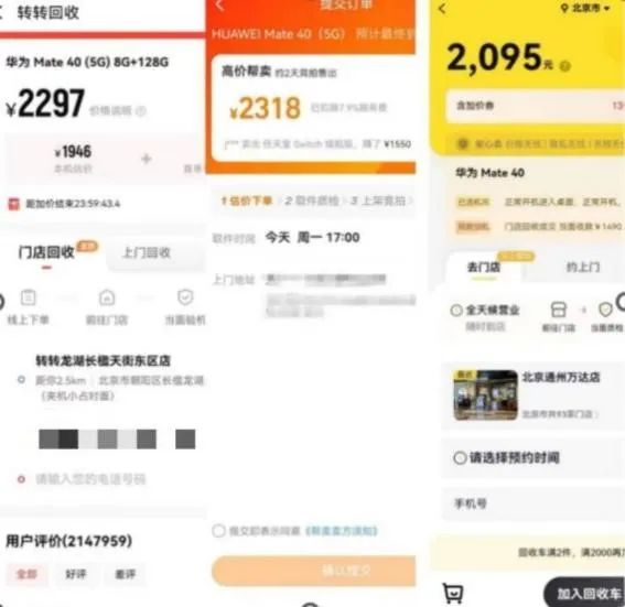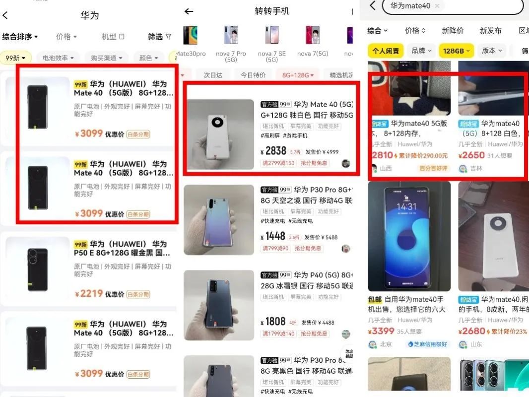 以野马财经试验的8G+128G 的全新国行华为 mate40为例,99新的二手产品在在转转上售价为2838元,而在闲鱼的售价3000元、2810元、2650元不等,而爱回收平台的售出价格统一为3099元。