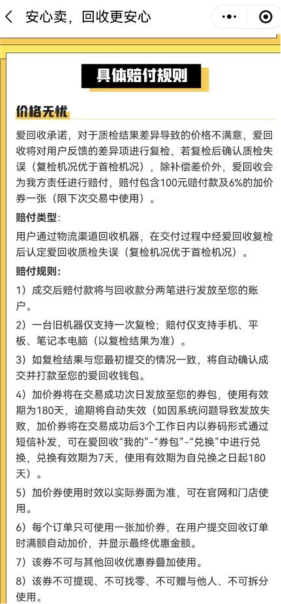 不过,野马财经发现,在爱回收小程序上明确标明了具体赔付的规则。规则显示,对于质检结果差异导致的价格不满意,爱回收将对用户反馈的差异项进行复检,若复检后确认质检失误,除补偿差价外,爱回收会为其责任进行赔付,赔付包含 100 元赔付款及 6%的加价券一张。
