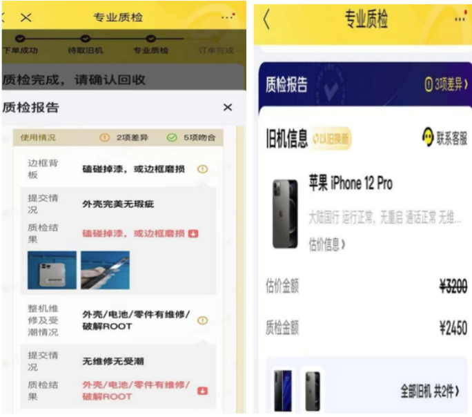 无独有偶,在黑猫投诉上,三十岁的北京海淀市民李先生表示,自己在爱回收出售一台苹果 iphone 12 pro,平台给出的估价是3200 元,但质检过程中却以“手机存在维修记录、轻微使用痕迹”为由,估价降至 2450 元。而李先生坚持表示自己的手机从未维修过。