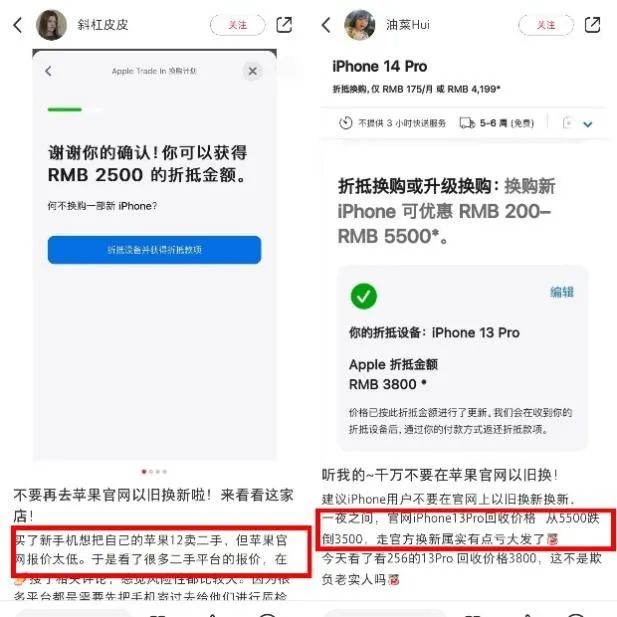 在小红书上,有消费者吐槽苹果官网回收旧手机价格低。对比手机官网,二手平台给出的回收价格似乎更诱人。在苹果官网Apple Trade In换购计划中,一台256G的iphone13售价3000元,而在爱回收回收价格为4120元;小米商城“以旧换新”的小程序上,一台几乎全新的8G+128G的小米11预估价格为772元,而在二手平台转转上的价格为1258元。