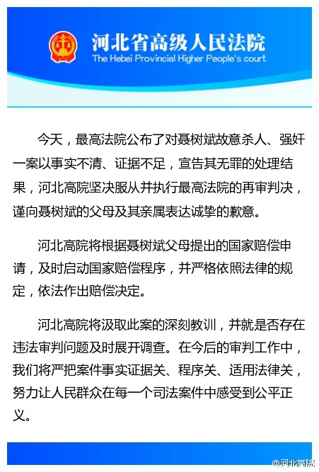 河北高院表示,今天,最高法院公布了对聂树斌故意杀人、强奸一案以事实不清、证据不足,宣告其无罪的处理结果,河北高院坚决服从并执行最高法院的再审判决,谨向聂树斌的父母及其亲属表达诚挚的歉意。