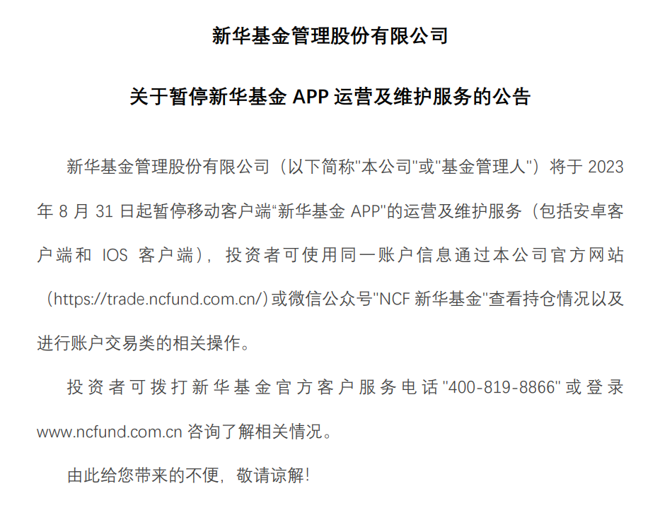 新华基金最近正处于多事之秋。今日,新华基金公告称,将于8月31日起暂停移动客户端“新华基金APP”的运营及维护服务。投资者可通过公司官网或微信公众号查看持仓情况并进行交易。
