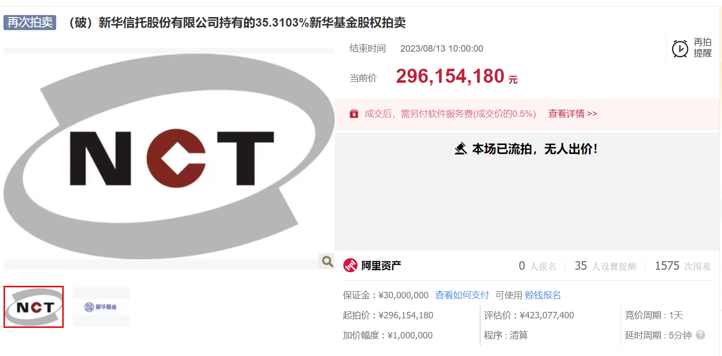阿里拍卖网数据显示,经历一拍、二拍之后,新华信托所持新华基金35.31%的股权第三次拍卖仍以流拍告终。第三次起拍价格为2.96亿元,较首次拍卖时的4.23亿元已降了1.27亿元,相当于七折“促销”。