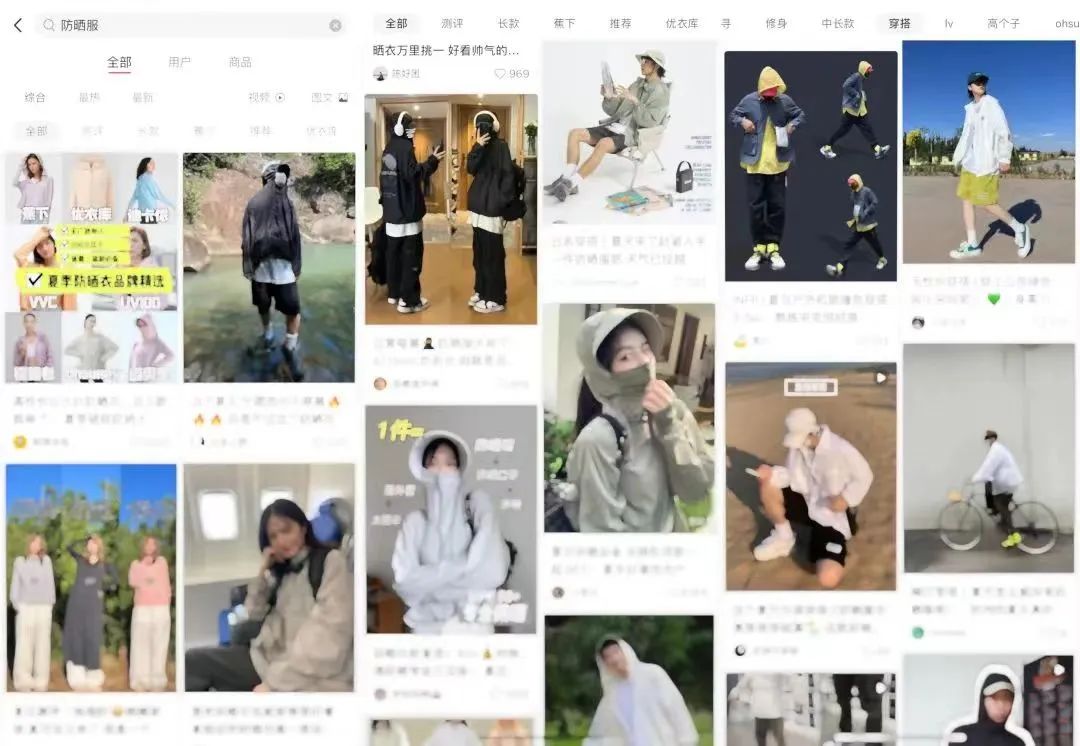 那为什么现在反而防晒衣后来居上,风头甚至盖过了“软防晒”(在社交平台上,关键词“防晒衣”的笔记数有192万篇,已超过“防晒霜”的133万篇)呢?背后与互联网的推波助澜脱不开关系。