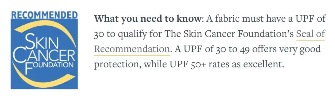 还有的防晒衣在宣传时强调“获得皮肤癌基金会”的推荐,听起来十分厉害。但从美国皮肤癌症基金会的官网可以看到,衣物UPF值只要达到30时,即可获得这款蓝色小图标,卖家玩的就是“障眼法”。
