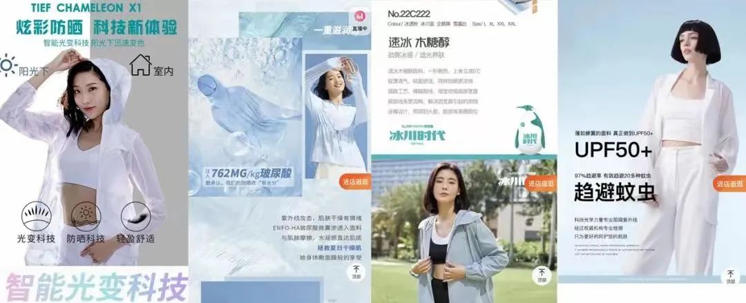 所以防晒衣的面料成分,成了各大商家“斗法”的关键。为了制造更多噱头,越来越多的原料被加入到防晒衣中,“TiO2防晒因子”、“湿态防晒科技”、“冰肤因子”等概念让人烟花缭乱,光看这些名词,就能感受到满满的“科技感”。
