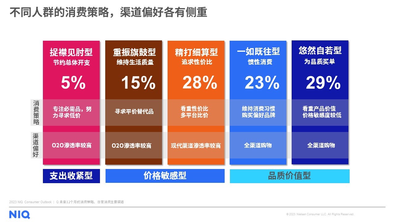 但是总体去看这五个类型,我们会发现,在以前的话,像悠然自若型,一如既往型的消费者,因为没有太多收入的顾虑,整个购物渠道选择上,更多即兴购买,更多到精品店购买,但是疫情之后,尤其今年年初的时候发现,哪怕他们对于自己未来收入依然保持积极的预期,但是购物选择上,尤其购物场景选择上,他们开始增加自己的网购的比例,增加会员店、折扣店的比例,整个价格敏感度的提升,是整体消费人群现在比较明显的趋势。