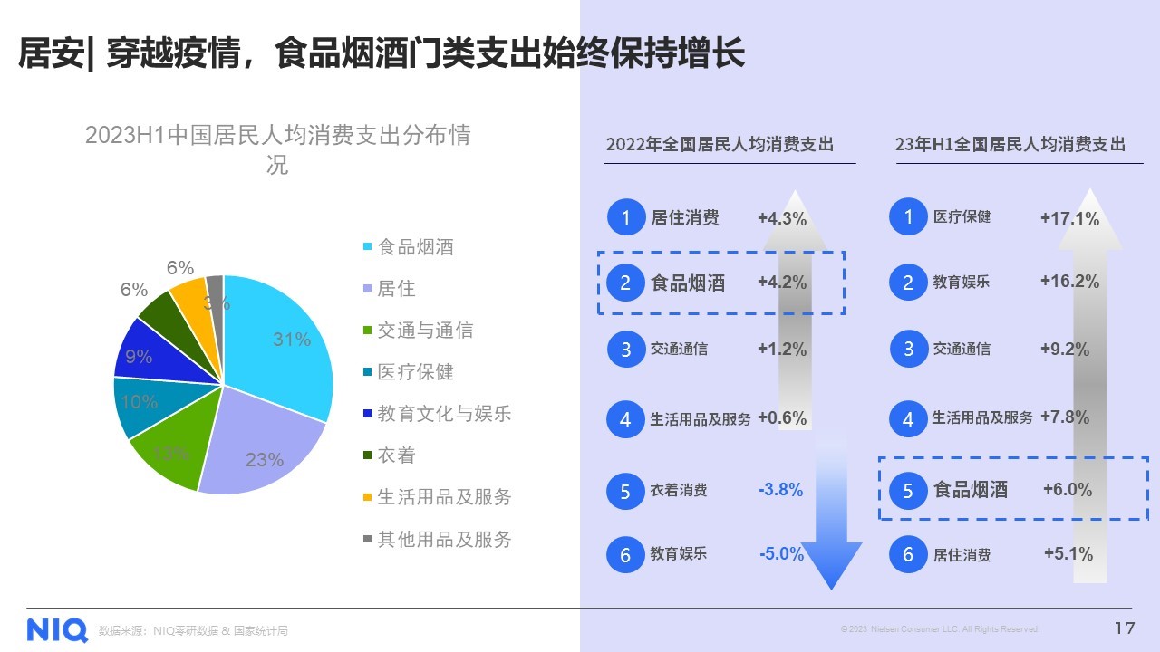 增长体现在哪些方面?这边列出来中国的消费者愿意花钱的一些品类,居民消费一些支出的意愿,我们可以看到,食品烟酒门类支出在近几年保持增长,在2022年重要性排在第二位,而今年放开以后消费者基础的食品烟酒虽保持增长,消费当中排位已经落到第五名,交通通信、教育娱乐等门类提升到比较靠前的位置。