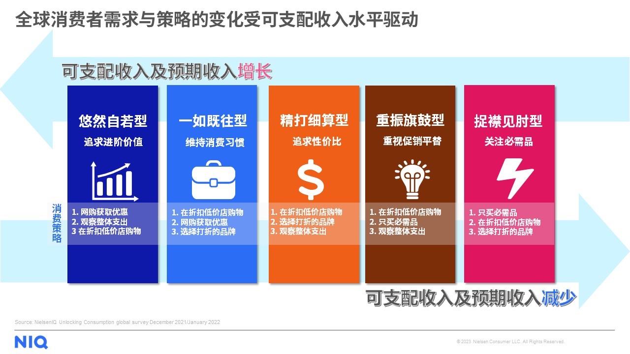 我们根据消费者对于未来的预期,以及对于现在的变化,把消费者分成五个类型,分别是“悠然自若、一如既往、精打细算、重振旗鼓、捉襟见肘”型。