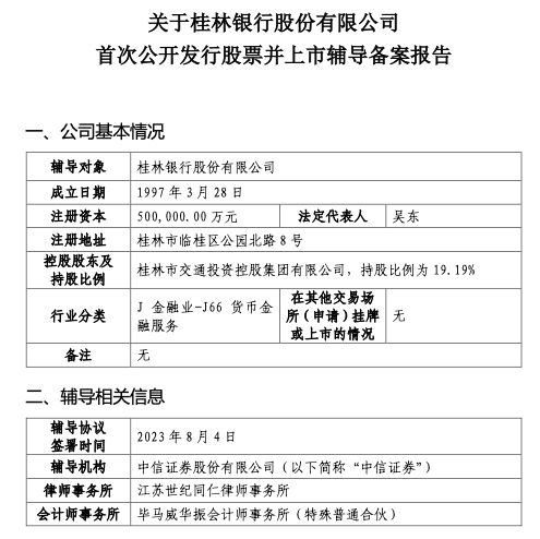 根据中信证券披露,该公司受聘担任桂林银行首次公开发行股票并上市的辅导机构。8月4日,中信证券与桂林银行签署了辅导协议。同一天,中信证券与桂林银行正式向中国证券监督管理委员会广西监管局报送辅导备案申请材料并于2023年8月10日获得受理。
