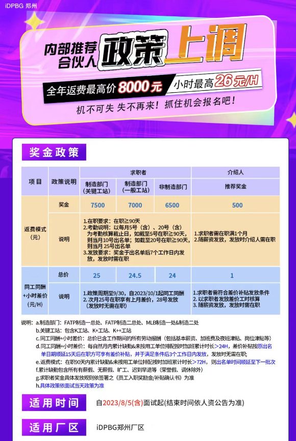 8月15日,“郑州富工联招聘”微信公众号发布招募信息,高价延期,郑州富士康26元/小时,或者返费8000元招聘(返费条件包括一定在职时长/打卡天数)继续。招聘海报显示,8月4日,企业官方公布告知市场:今年市场最高价已敲定,并且消息很快传播河南市场。