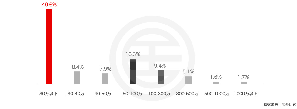 以上数据,根据2016年1-5月所有在居外网搜索、查询美国房产的数据分析、整合而来。该数据显示,65.9%的购房者咨询50万元以下的房产,16.3%的购房者咨询50万到100万的房产,9.4%的购房者咨询100万到300万的房产,咨询价值在300到500万元房产的中国买家占比为5.1%,咨询500万以下房产的中国买家占比为96.7%,其中,1.6%的购房者咨询500万到1000万以上房产,咨询价值在1000万以上购房者仅占1.7%。