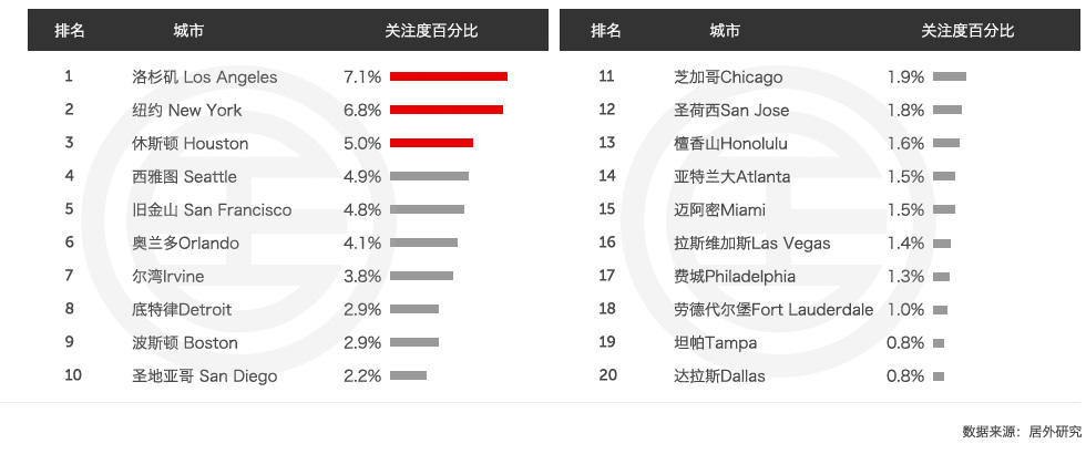 居外网数据显示,2016年,中国买家赴美国购置房产最关注的城市10个分别是:洛杉矶、纽约、休斯敦、西雅图、旧金山、奥兰多、尔湾、底特律、波斯顿、圣地亚哥。