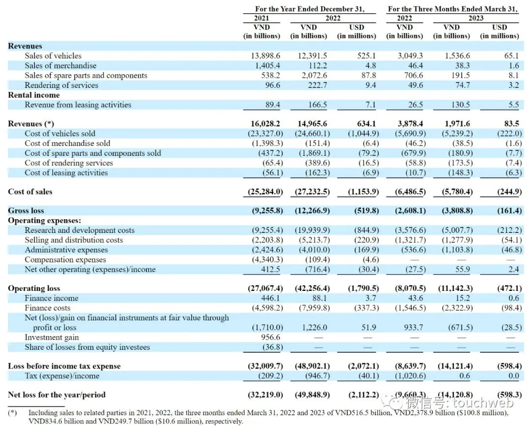 VinFast在2023年第一季度营收为8354万美元,运营亏损为4.72亿美元,净亏损为6亿美元。