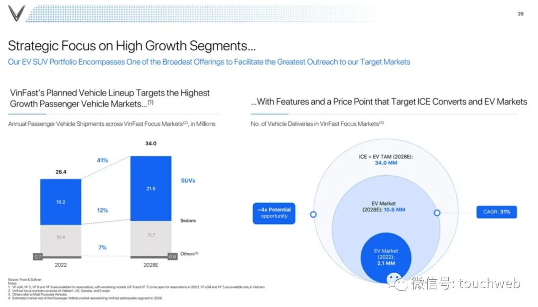 VinFast于2022 年转型为纯电动汽车制造商,迄今为止已向越南客户交付四款电动汽车车型:VF e34、VF 8、VF 9 和 VF 5。VinFast在2023年早些时候第一批VF 8电动汽车出口到北美。
