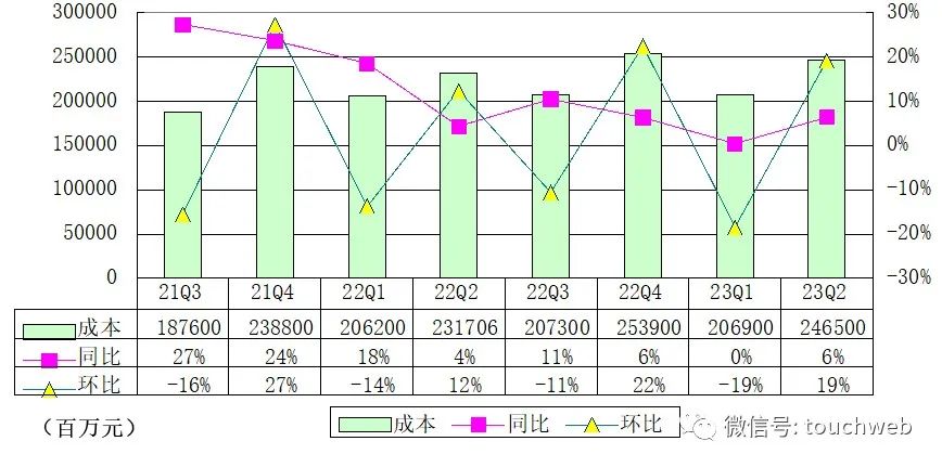 京东2023年第二季度成本为2465亿元(约340亿美元),较上年同期的2317亿元增长6.4%。
