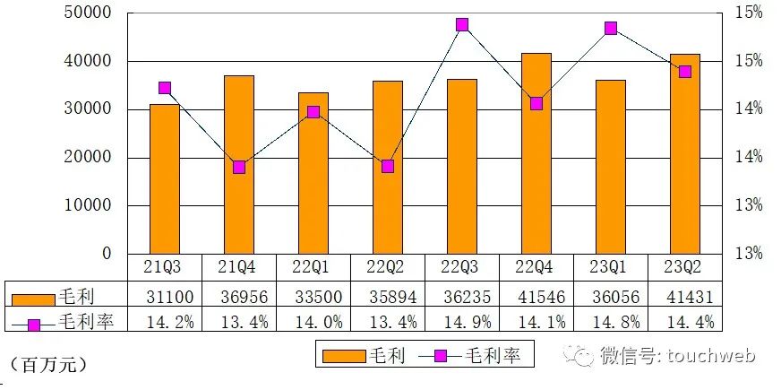 京东2023年第二季度毛利为414亿元,毛利率为14.4%。
