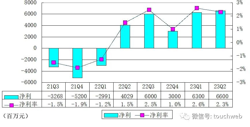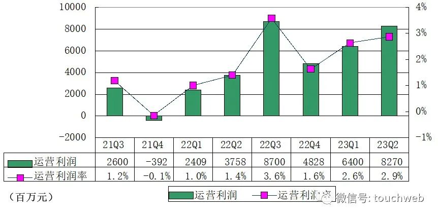 京东2023年第二季度运营利润为83亿元(约11亿美元),而上年同期运营利润为38亿元。京东2023年第二季度运营利润率为2.9%。