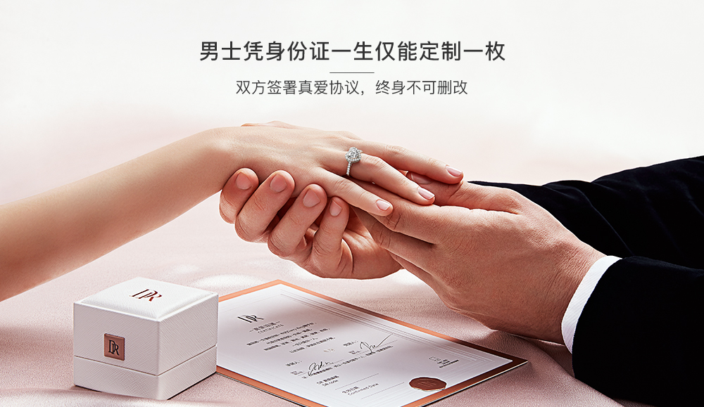 求婚钻戒恰好能将这份真爱具象化,带着“男士一生仅能定制一枚”的独特规定,DR钻戒正式走进大众视野。