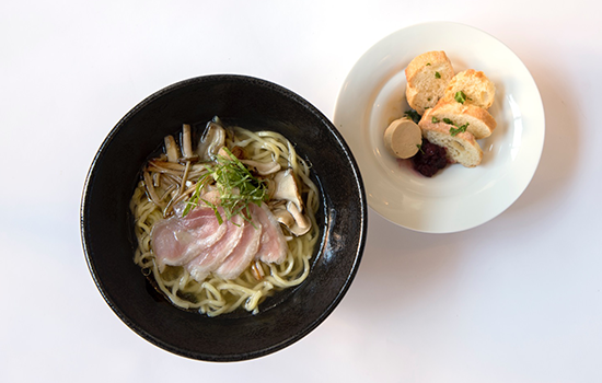 ▽陆之流星面:不放盐、只加了生鸭肉火腿的汤底,面上的叉烧也是鸭肉。配菜则是搭配了鹅肝酱的烤面包。