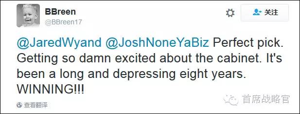 @BBren :“完美的人选,这届内阁太让人惊喜了。过去真是漫长的、令人沮丧的8年。胜利!!!”