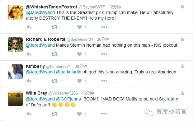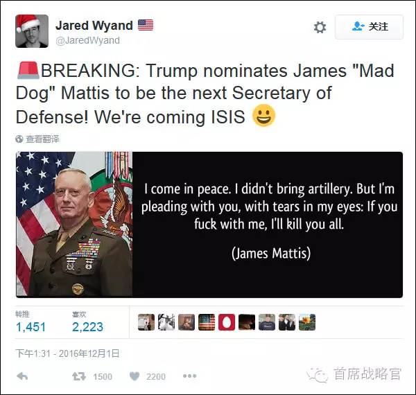 @Jared Wyand 说:“特朗普任命疯狗为国防部长!IS(极端组织“伊斯兰国”),我们来了!”