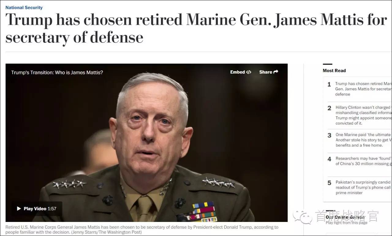 12月1日,在辛辛那提周四晚间的一次集会上,美国候任总统特朗普表示,他已经选择退役海军陆战队上将、绰号“疯狗”(Mad Dog)和“武僧”(Warrior Monk)的詹姆斯.马蒂斯作为美国第26届的国防部长。