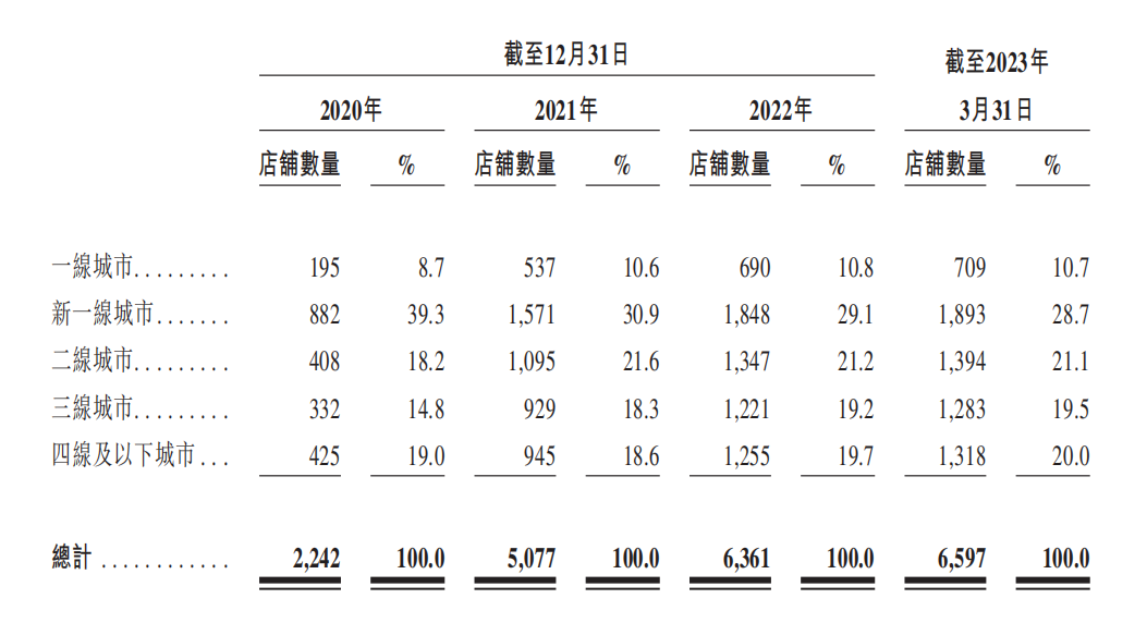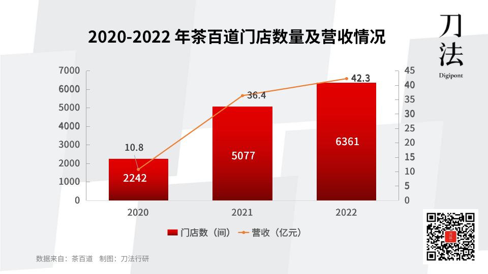 茶百道将这种轻资产运营模式复制到了全国。根据招股书,品牌在 2020-2022 三年间门店数依次为 2242、5077、6361 间,庞大的线下网络拉动门店收入从 10.8 亿元增至 42.3 亿元,年复合增长率达到 97.9%。