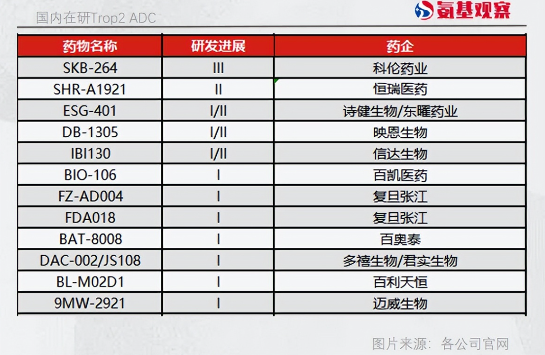 据不完全统计,目前国内在研的Trop2 ADC已达十余款,分别来自于科伦博泰、君实生物、诗健生物、复旦张江、多禧生物、映恩生物、迈威生物、百利天恒。其中进度最快的是科伦博泰。