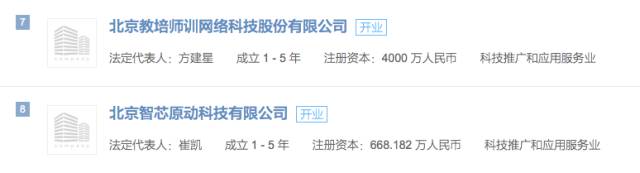 这些公司中,在线教育领域的有两家公司,分别是北京教培师训网络科技股份有限公司和北京知识印象科技有限公司。其中,北京教培师训网络科技股份有限公司(主要产品是中国教师教育网)曾申请新三板挂牌,而“东辰”则在北京教培师训网络申请挂牌前夕,花600万元获得了该公司1.5%的股权。北京知识印象科技有限公司是作业盒子的实体公司,2015年7月,刘强东和东辰共同投资了作业盒子,共同持股约5%。