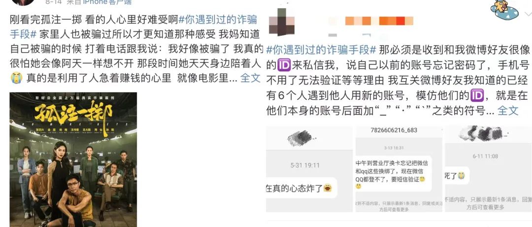 超高票房成绩背后,是《孤注一掷》对现实精准的洞察与判断。电影首次将诈骗产业链内幕搬到大银幕上,对不同类型的受害者的受骗经历进行了细致刻画,让观众代入其中,产生强烈的情绪。微博上,伴随着电影热映,“反诈”话题热度走高,“你遇到过的诈骗手段”、“看完孤注一掷你想起了谁”等相关话题下,网友从自身经历出发讲述诈骗经历,强烈的表达欲背后在于电影切合了近两年日益高涨的“全民反诈”社会氛围。