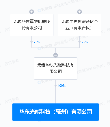天眼查APP显示,近日,华东光能科技(亳州)有限公司成立,法定代表人为程帝军,注册资本6亿元,经营范围包含:光伏设备及元器件制造;太阳能发电技术服务;数字技术服务;物联网应用服务;电池制造等。天眼查股权穿透显示,该公司由华东重机、无锡宇杰投资合伙企业(有限合伙)间接共同持股。