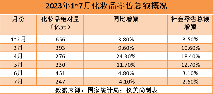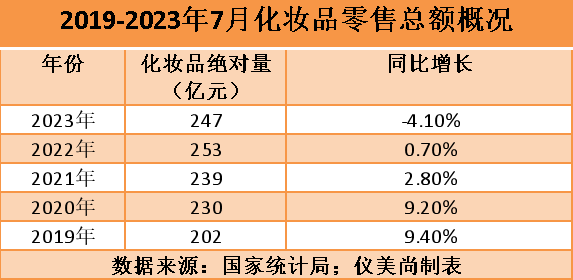 值得注意的是,这是今年1—7月录得的最低化妆品零售数据,也是自2019年以来,化妆品零售总额首次在7月出现下滑现象。