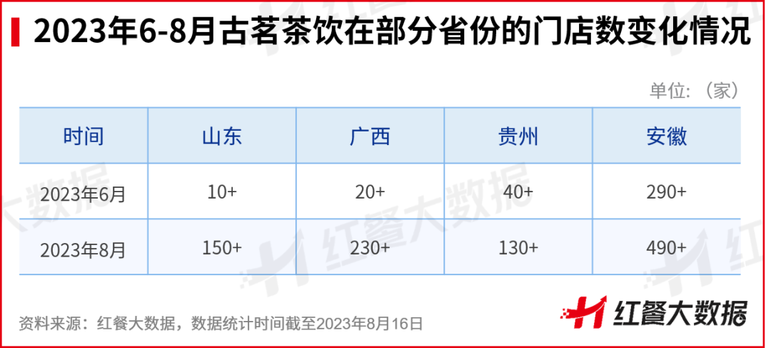 据古茗茶饮方面透露,其2023年主攻的省份(自治区)是山东、广西、贵州、安徽。据红餐大数据,2023年6-8月,古茗茶饮在上述省份的门店数均有不同程度的增长。