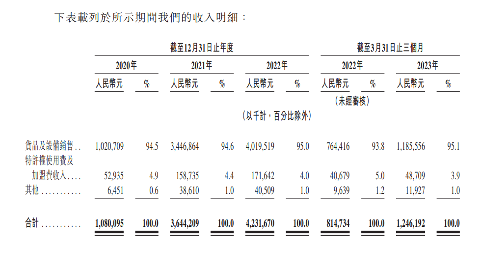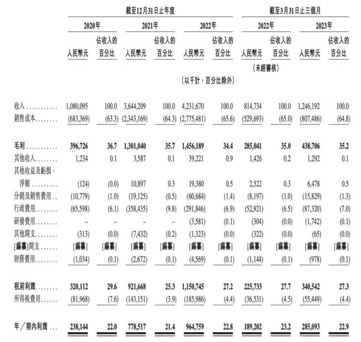 招股书显示,茶百道2020年-2022年收入分别约为10.80亿元、36.44亿元和42.32亿元;2023年第一季度收入约为12.46亿元。同期期内利润分别约为2.38亿元、7.79亿元、9.65亿元和2.85亿元。