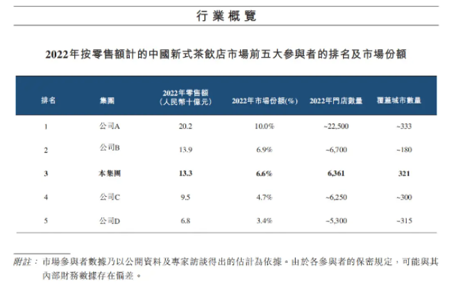 此外,该报告还显示,2022年按零售额计,茶百道在中国新式茶饮店市场排名第三,市场份额占比6.6%,与第一名相差3.4%,与第二名仅相差0.3%。