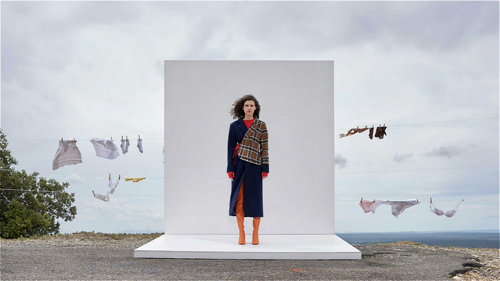 今年,品牌还重新设计了官网。出现在页面上的衣服不再以白墙为底,模特身着时装出现在虚拟舞台上。背后是几排飘着衣物的晾衣绳。