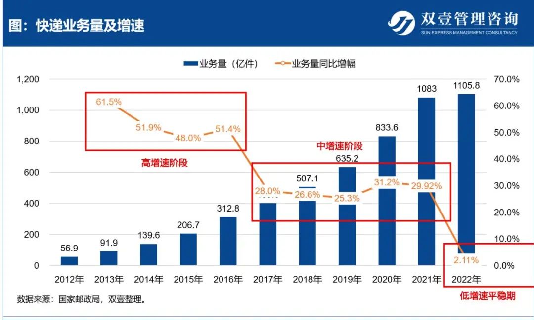 近年来,我国电商经济体量增速放缓,整体营收增速也在放缓,说人话就是产品销量越来越高,但利润越来越平缓。而快递行业伴生于电商,本就是电商吃肉,快递喝汤,现在喝汤都要加水稀释一下了。