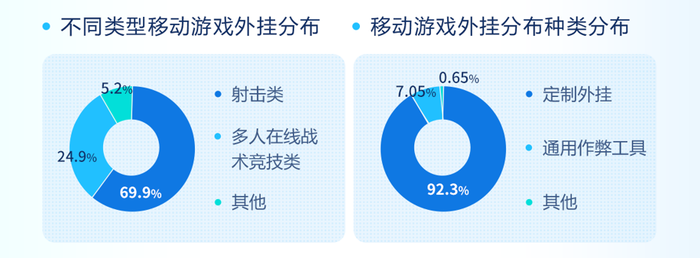 在移动游戏中,外挂同样集中在射击类,其次为多人在线战术竞技类,值得注意的是,今年上半年移动游戏外挂中,定制外挂的占比从2022年的74.4%增长到了92.3%。