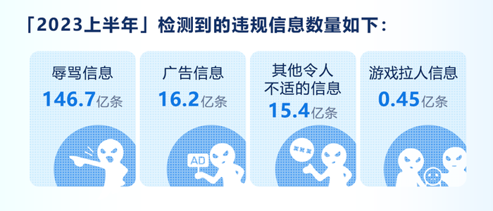 2023年上半年,腾讯游戏安全检测到的辱骂类信息达146.7亿条,辱骂信息是游戏中最容易出现的违规内容。其次为广告类信息、和令人不适的信息、以及游戏拉人等信息。