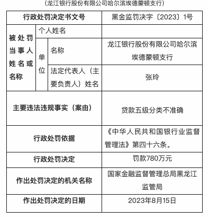 8月17日,国家金融监督管理总局公布的行政处罚信息公开表显示,2023年8月15日,龙江银行股份有限公司哈尔滨埃德蒙顿支行因贷款五级分类不准确,被处罚款780万元。
