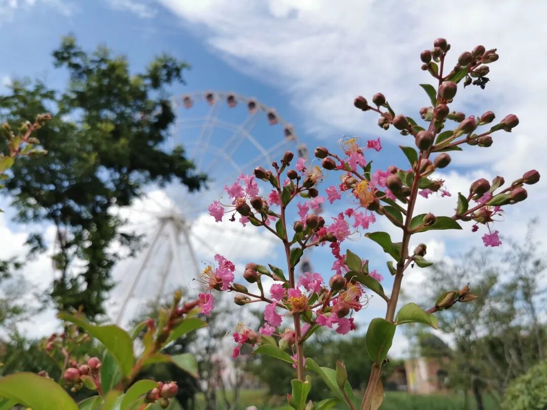 顾村公园的紫薇,主要分布在摩天轮东侧的稀疏草地和儿童游乐场南侧的草坪上,有的花朵呈现出鲜艳夺目的紫红色,有的花色比较浅,呈粉白色,在蓝天白云下随微风摇曳,吸引了偶尔路过的游客。曹女士来自河南省,她和孩子们趁着暑假专程来上海游玩,顾村公园是他们计划中的打卡地之一,和紫薇的相遇是他们在这里的一大收获。