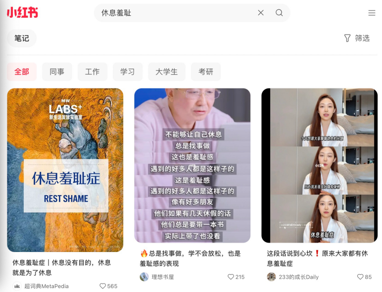 “休息羞耻”冲上微博热搜,相关讨论已达1.2万,阅读高达2140.3万。在小红书中,与之相关的笔记也数量众多,关系到当代年轻人的学习、考研、就业、升学、请假。