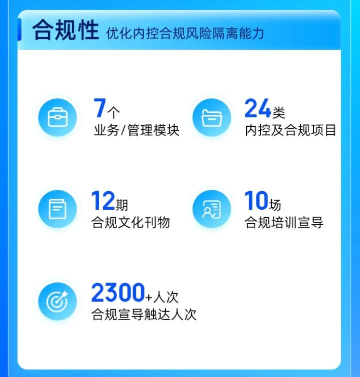 - 上半年推动24类内控、合规问题项进行优化提升;进行合规培训宣导10场/次,触达人次2300+。