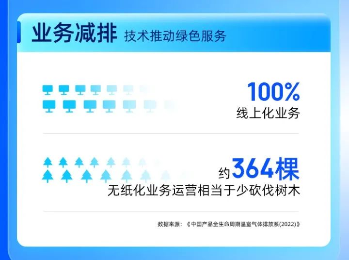 - 100%线上化业务开展,2023上半年无纸化运营相当于少砍伐约364棵树木。