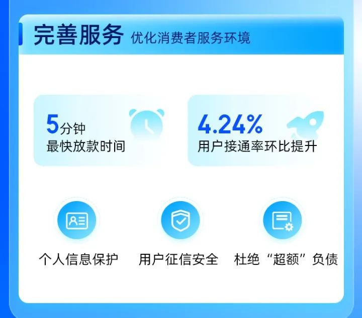 信飞科技持续深化内控合规建设,推进业务稳健发展,合规管理覆盖7大业务/管理模块,2023上半年合规政策研究内刊出刊12期;同时借助科技赋能持续完善优化用户服务,实现最快5分钟放款服务,为用户提供高效便捷的融资服务。