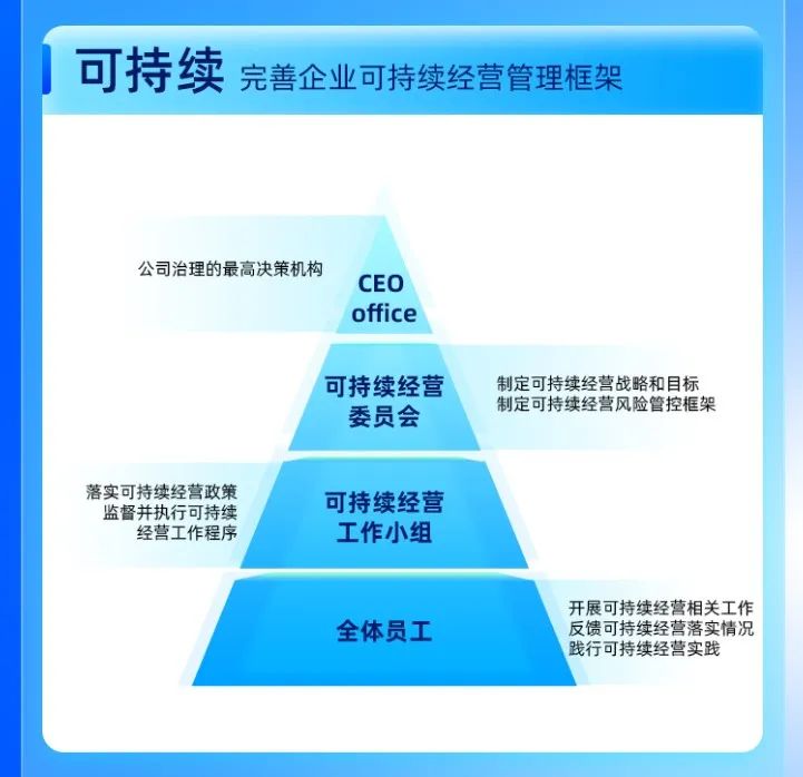 - 将可持续发展纳入公司战略,由CEO Office牵头成立可持续经营委员会,不断完善管理框架,推进可持续运营。